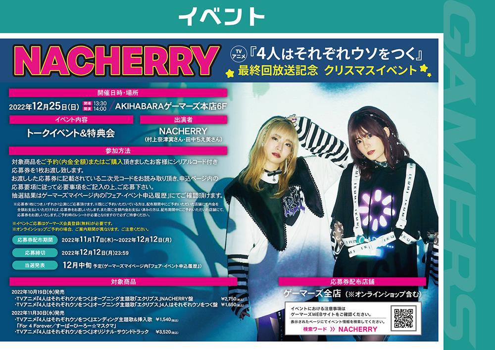 NACHERRYが12月25日(日)にAKIHABARAゲーマーズ本店6Fイベントスペースにて、CD購入者を対象としたトークイベント&特典会を実施することが決定!